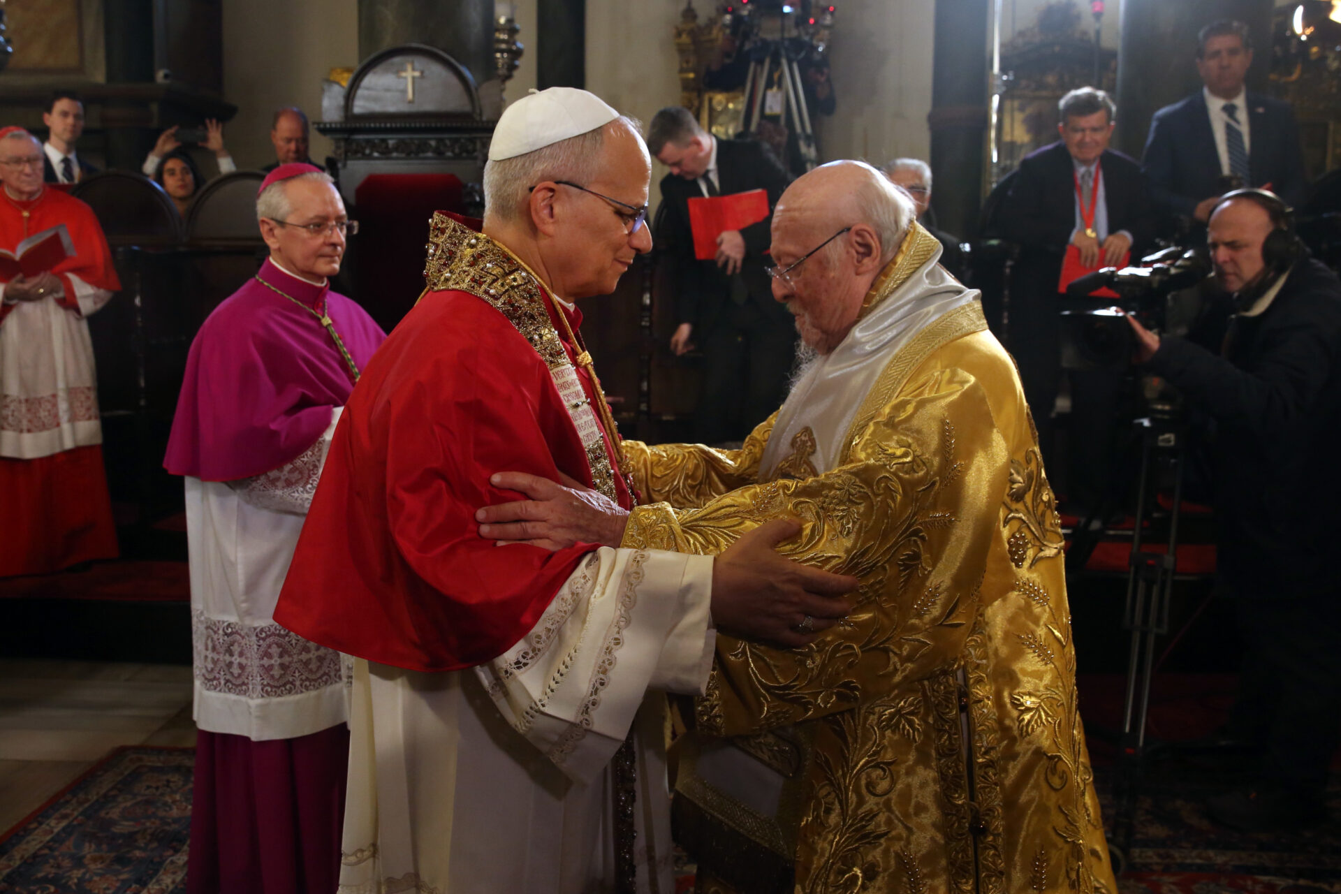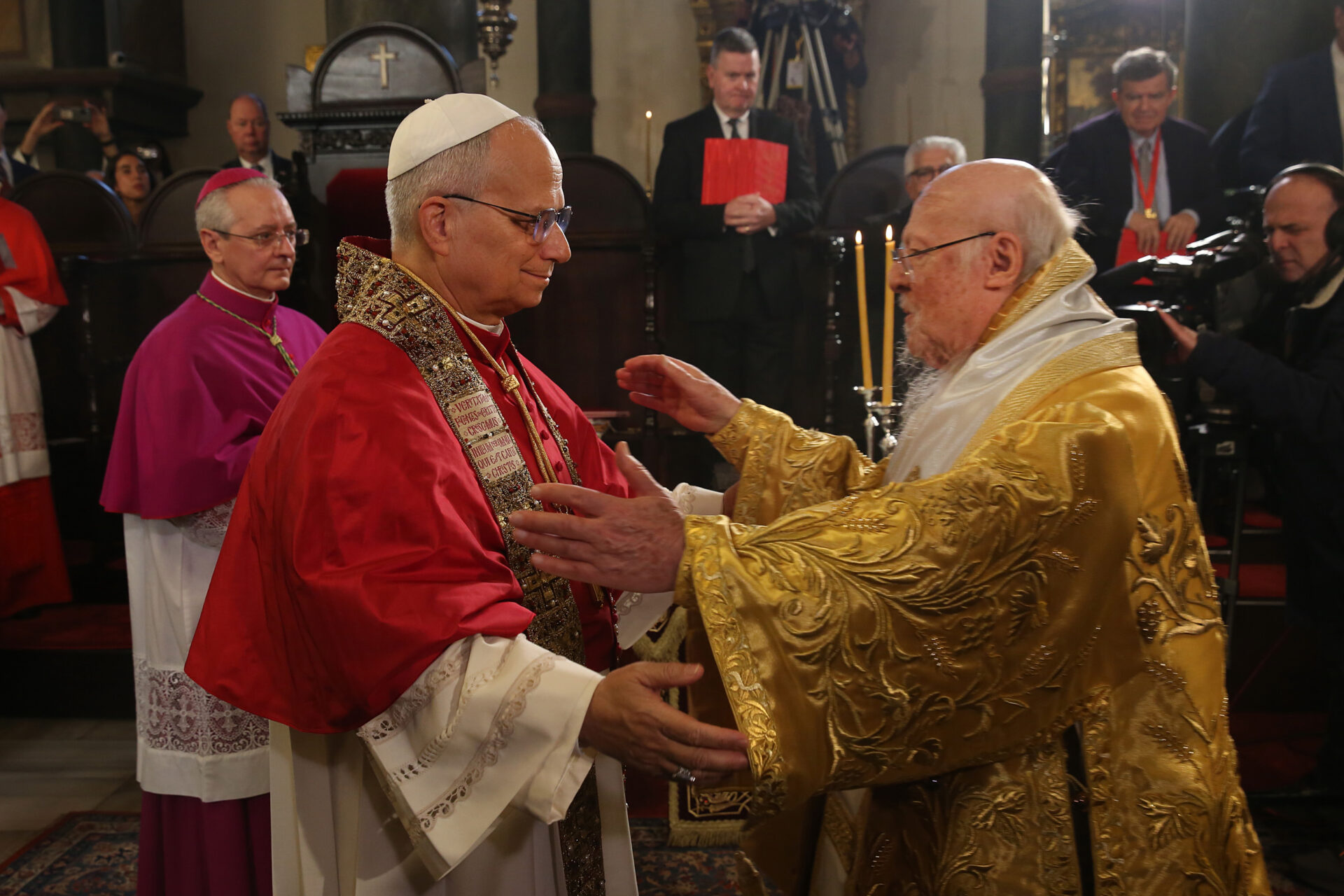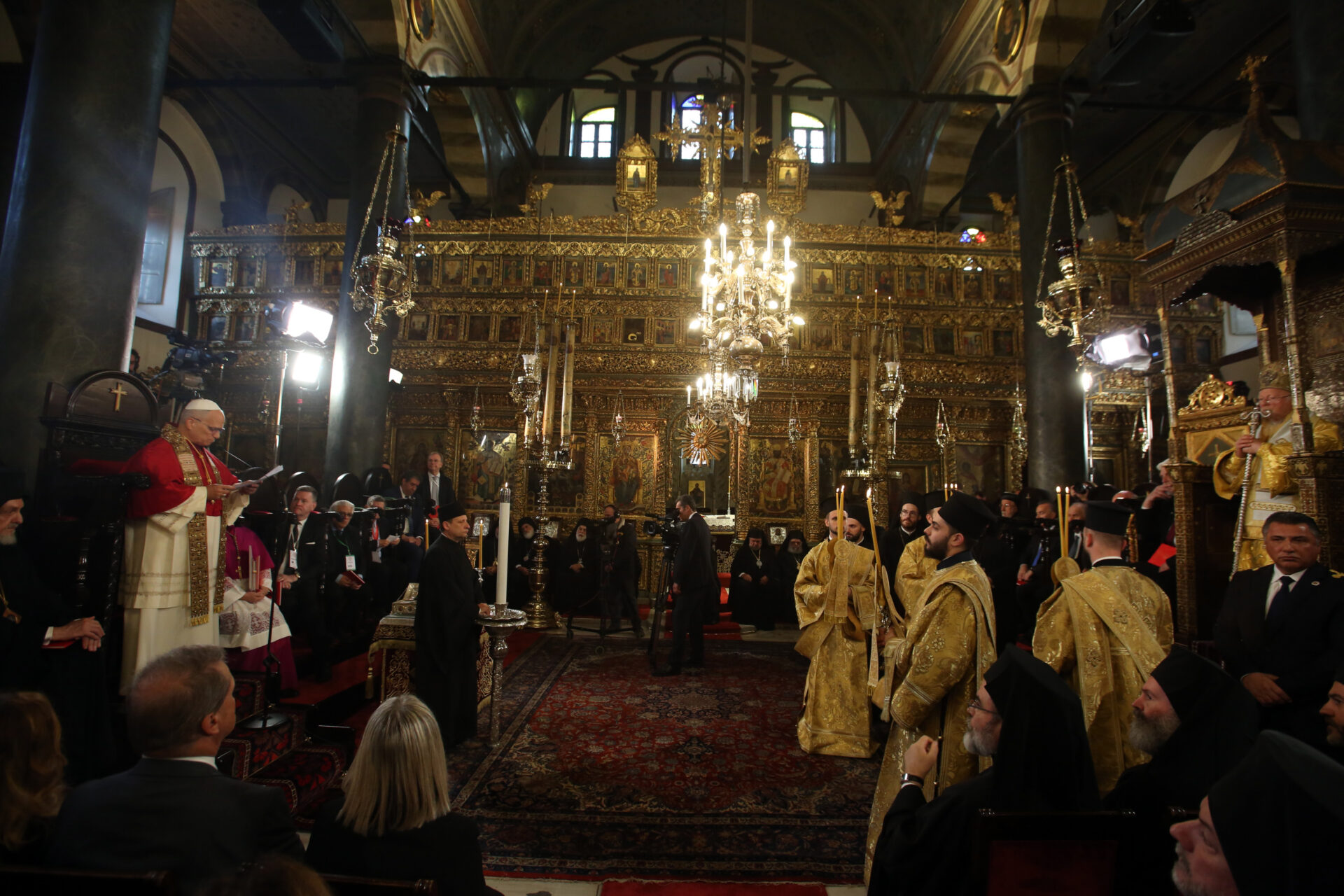 Καλωσορίζοντας στον Πάνσεπτο Πατριαρχικό Ιερό Ναό Μεγαλομάρτυρος Αγίου Γεωργίου Φανάρι Κωνσταντινούπολης ο Οικουμενικός Πατριάρχης κ.κ. Βαρθολομαίος τον Αγιότατο Επίσκοπο και Πάπα Ρώμης κ.κ. Λέοντα ΙΔ’ , στην θρονική εορτή Πρωτοκλήτου Αποστόλου Αγίου Ανδρέα του Οικουμενικού Πατριαρχείου.